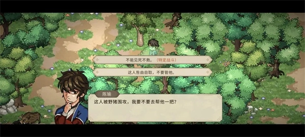 (1)前往无名地区→迷踪林(对应上图地图标点处),触发过场剧情后,选择“不能见死不救……”这一选项,随即触发战斗(需击败4只野猪)。