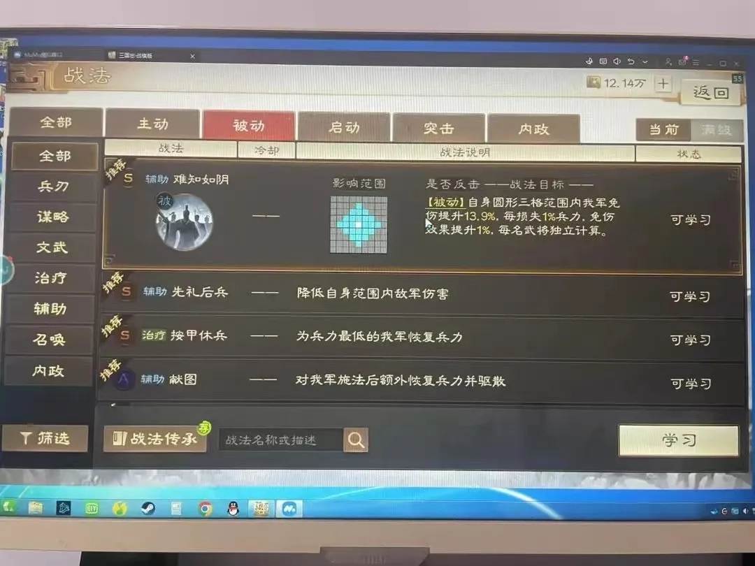 传承战法【难知如阴】,是一个被动战法,效果是自身圆形三格范围内我军免伤提升7%,每损失1%兵力,免伤效果提升1%,每名武将独立计算。(数据以文字版为准,上图是小道消息)