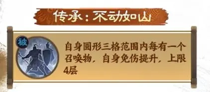 传承战法是【不动如山】是一个被动战法,效果为自身圆形三格范围内每有一个我军召唤物,自身免伤提升24%,上限4层。