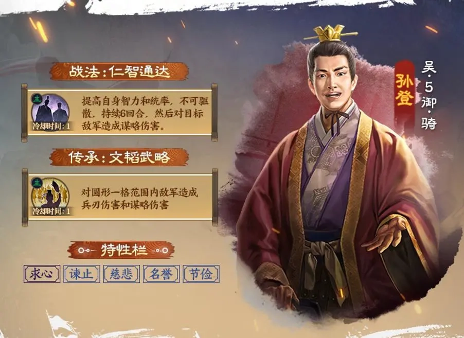 孙登,吴国5御骑兵,自带战法【仁智通达】,是一个1CD主动战法,效果为使自身智力、统率提升30,不可驱散,持续6回合,然后对目标敌军造成212%谋略伤害。