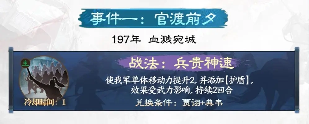 1CD的主动战法,给单体提供移动力并添加护盾,而且受武力影响,目测算是能用的,比如给马腾祝融这种用,当提供治疗了。兑换需要用到贾诩比较贵,非常需要使用的时候再换。