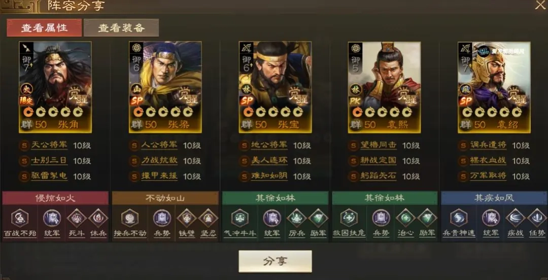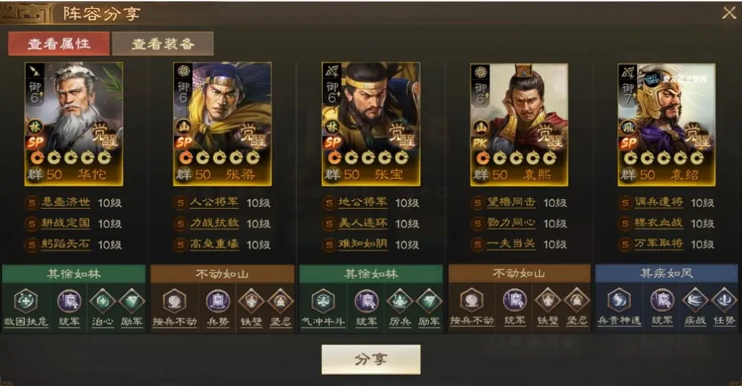 这套四保一SP袁绍阵容,以SP张梁担纲主坦,负责伤害分摊与功能性辅助;SP张宝则为SP袁绍加持属性;SP华佗司职治疗;袁熙作为工具人,同时也承担着为SP袁绍分摊伤害的职责。