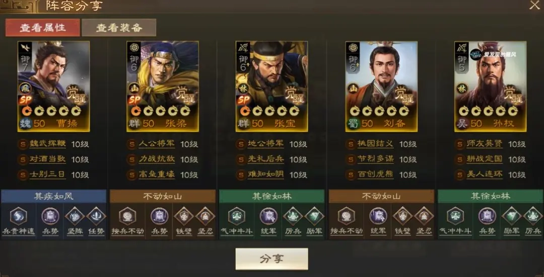 SP张梁带来的断粮、减伤与武力智力加成效果,对SP曹操均能生效;并且SP张梁本身是合格的主坦克,可保障SP曹操的生存。SP张宝一方面为SP曹操提供属性加成,另一方面能凑齐黄巾武将阵容,让SP张梁有更多触发稻草人的机会。刘备的作用是分摊SP曹操承受的伤害,同时进行解控操作。孙权则负责给予属性加成与治疗,能让队伍属性快速提升,当SP曹操兼具高增伤与高属性时,输出会变得十分强力。