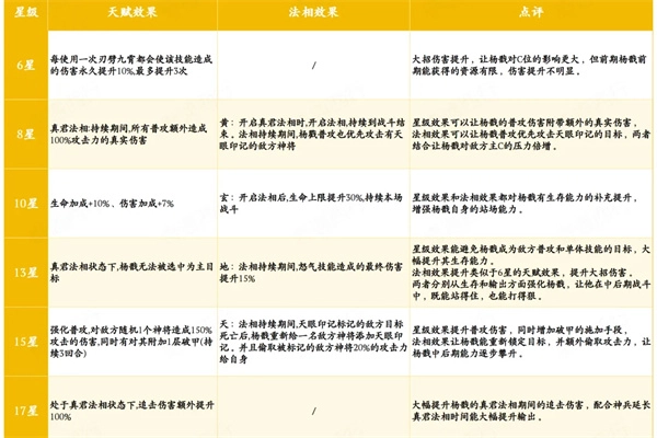 杨戬在前中期主要扮演副C角色,负责锁敌、破甲以及提供稳定输出,所以前期对他的星级要求不算高,资源应该优先供给主力输出。等进入中后期,己方主C发育成熟、阵容逐渐稳定后,再慢慢加强杨戬的培养——建议把星级提升和法相效果的提升同步进行,尽早解锁天阶法相,这样杨戬在中后期的收割能力会大幅提升,成为克制敌方主C的重要力量。