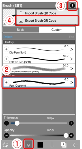 1、打开①画笔窗口。选择②笔(自定义),再从③菜单中选择④导出笔刷QR Code。
