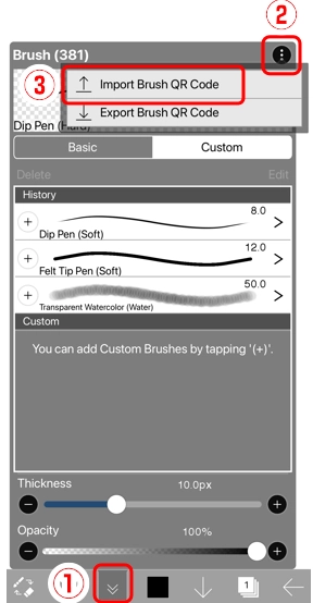 4、若需导入笔刷QR Code图像,可先打开①画笔窗口,接着从②菜单中选择③“导入笔刷QR Code”选项。