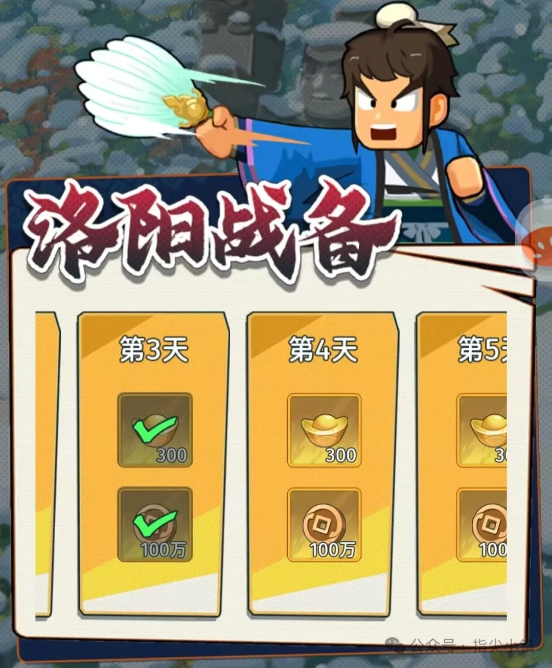 洛阳战备期间,每天都可以领取300元宝和百万铜币。