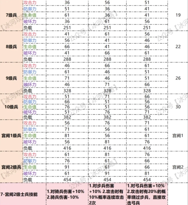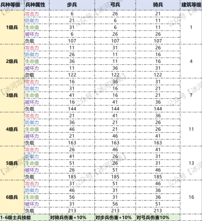 请看下图,图中展示了不同等级兵种的属性信息,以及不同等级的兵营能够训练出更强兵种的对应关系。