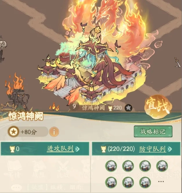 ②9级城池的防守妖物妖力强、数量多,不妨先让其他盟去攻打,这样能消耗他们的复活次数,等拆城防时我们再集体出击(不过这样做会损失一部分个人积分)!