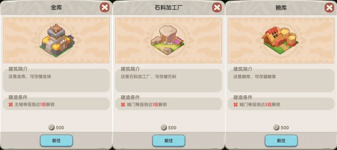 在我看来,资源是非常关键的,毕竟不管养成什么不得消耗点资源?把金库、石料加工厂、粮库这三大建筑建造好,它们能分别储存收获到的金块、石料、粮草,为我们之后的养成之路奠定好基础!