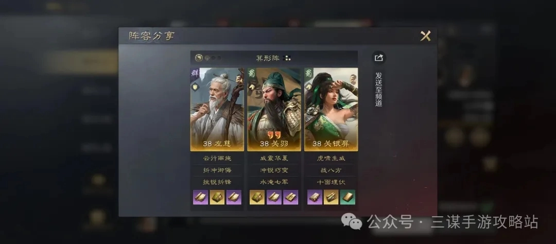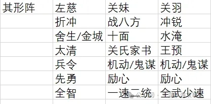 关羽和关银屏的兵书选择机动搭配励心,左慈的兵书则以减伤为主要方向。