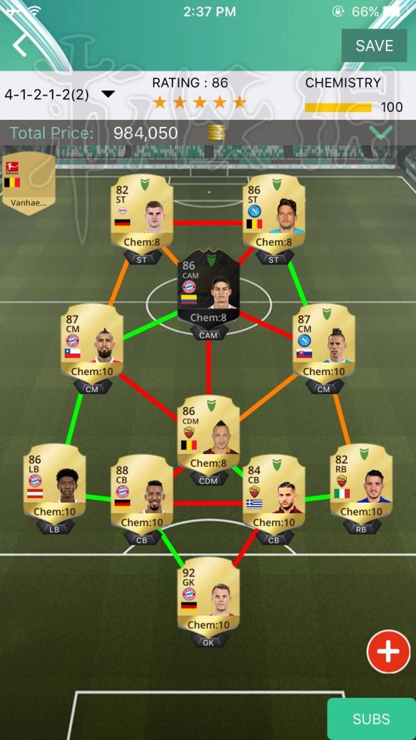 简单聊聊这套阵容的思路吧。受限于德甲50+1政策,联赛人才储备确实不如英超充裕,这种情况下不同联赛混搭就成了最优解——英超球员身价太高,转而选择意甲正好,性价比拉满。预算100万打造德意混搭阵,默契值能拉满100,选的是版本强势的41212阵型,人员配置兼顾了实战能力、效果和视觉上的搭配感。中场那三个“扫把头”是这套阵的核心,相当于三核驱动的三条“大腿”,硬度十足,基本是毕业级金卡的水平,能力没话说,还自带赵旭日+冯潇霆的撞脸buff;对比波霸、坎特、德布劳内的价格,性价比高到离谱。再配个古典前腰,两个速度型前锋,前场传切配合像打乒乓一样流畅。后场防守也够稳健,没什么明显软肋。这就是这套百万预算的混搭阵容推荐。