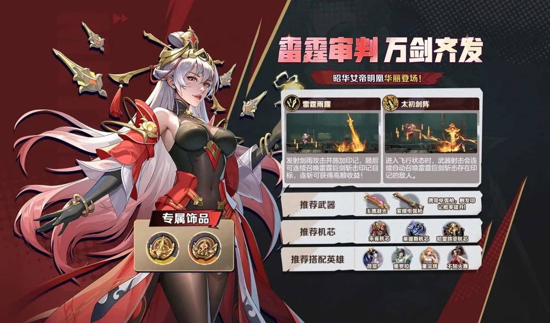 合金弹头觉醒S6赛季即将推出全新英雄——明凰,这位明艳动人的昭华女帝将华丽登场。她拥有剑灵守护与雷霆审判之力,还能召唤飞剑对带有印记的目标敌人发动斩击!关于她的具体技能效果,小编会在接下来的内容中为大家详细介绍!