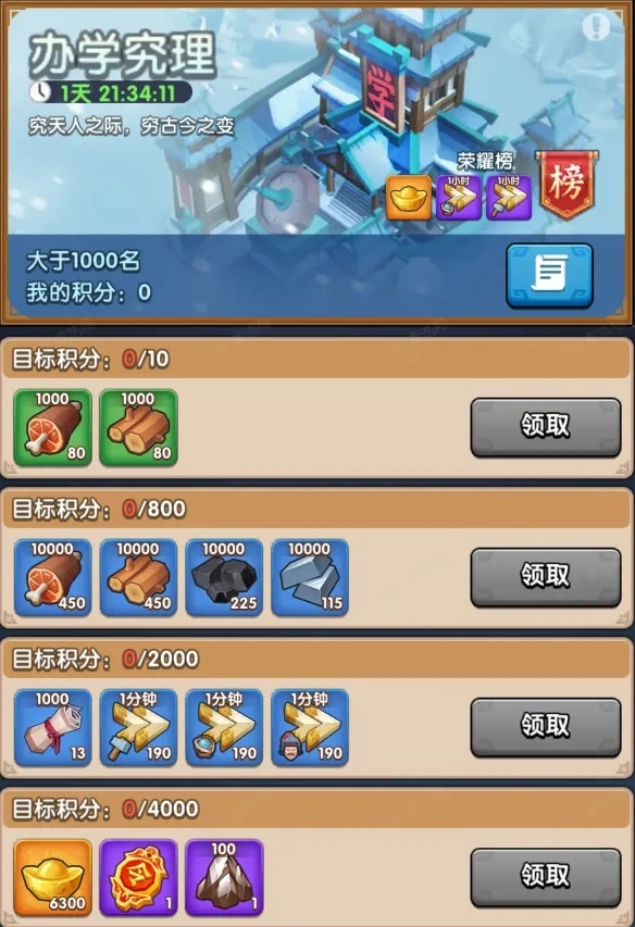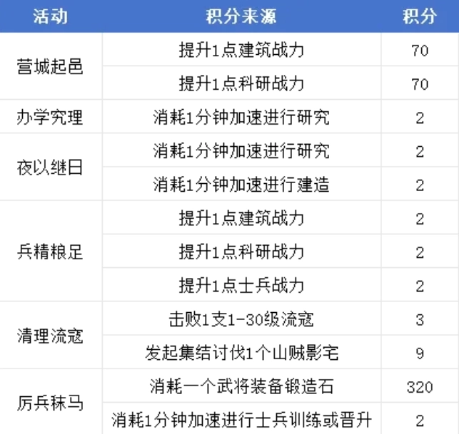 【营城起邑】【办学究理】【夜以继日】【兵精粮足】【清理流寇】【厉兵秣马】这6个活动各对应一个主题,每个主题日持续2天。完成对应主题下的任务可获取积分并领取积分达成奖励,此外,每个活动中达成相应排名还能获得丰厚的排名奖励。