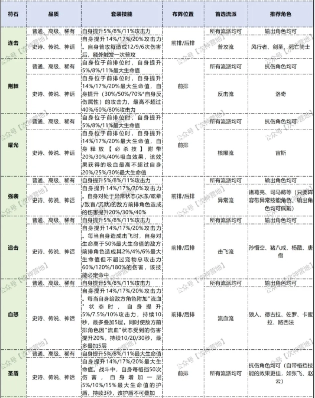 ②每个符石都对应着一套专属套装,当角色的4个部位都佩戴了同一套装的符石时,就能激活该套装的技能。套装技能仅对当前佩戴符石的角色产生效果,而且激活的套装技能品质取决于所佩戴符石中的最低品质。