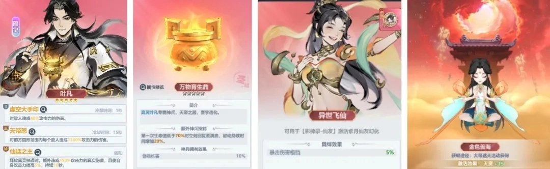 消耗源天神觉即可参与抽奖,奖品包含叶凡真灵、叶凡专武、幻境以及紫月幻化。叶凡的属性为真实伤害,其专武具备特殊效果:当生命值低于70%时会立即回满,同时还能延长真实伤害的持续时间。