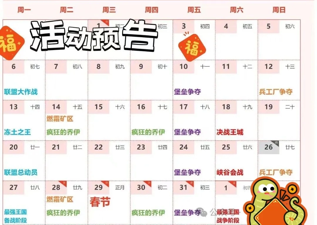 2春节那一周的活动安排得相当丰富。周六开展峡谷活动,让大家先活动活动筋骨;周日则是兵工厂活动,方便大家好好筹备装备。周一到周四,我们把这段时间叫做备战周,大家可以利用这段时间调整状态、积蓄精力,为后续活动做好准备。大年三十当天,我们准备了乔伊和燃霜活动,增添节日热闹氛围。至于春节当天,就安排大家好好休息一天,尽情感受节日的温馨氛围。