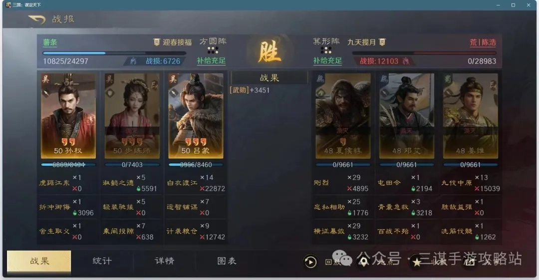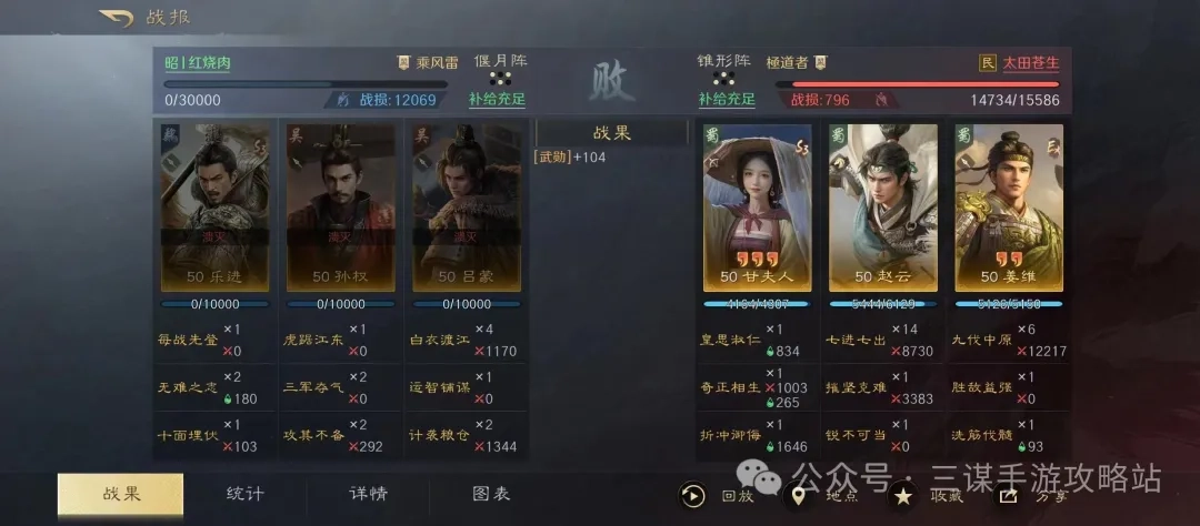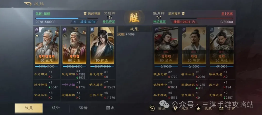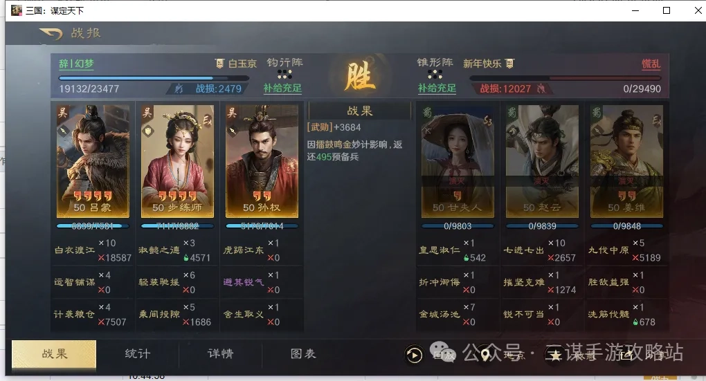主要是依靠郭嘉的爆发输出解决了先登吕布,金城和一计决胜这两个技能应该发挥了重要作用,吕布几乎没打出什么输出。
