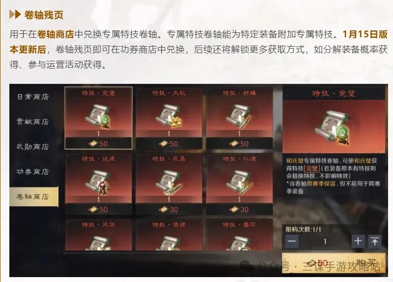 功券兑换的卷轴残页,有另一个重要功能:兑换专属特技。