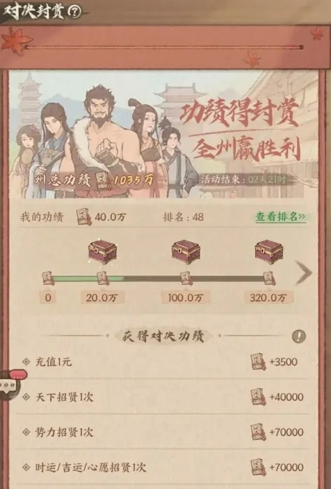 这城有良田对决封赏活动是游戏里的重要玩法,玩家参与每日的沙场争锋、州对决等玩法,能获取军绩和对决功绩,用来兑换各类奖励,像珍贵道具、资源以及提升实力的关键物品都在其中。