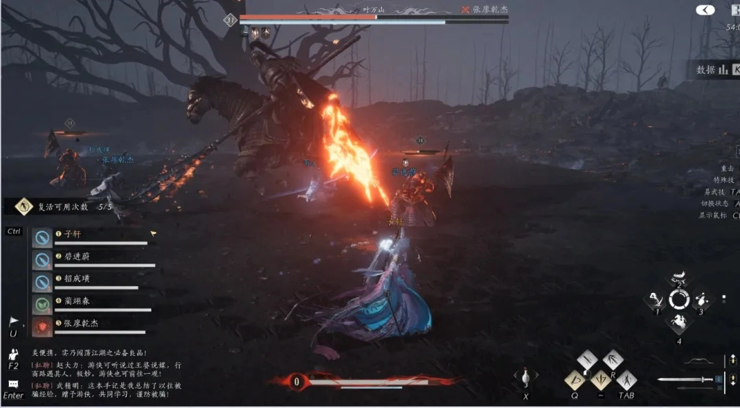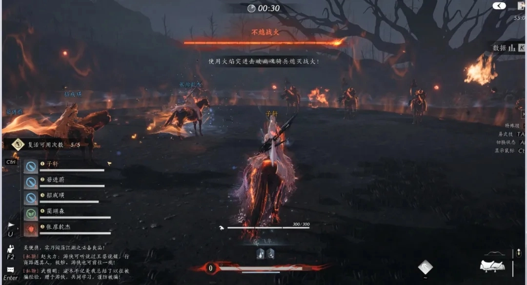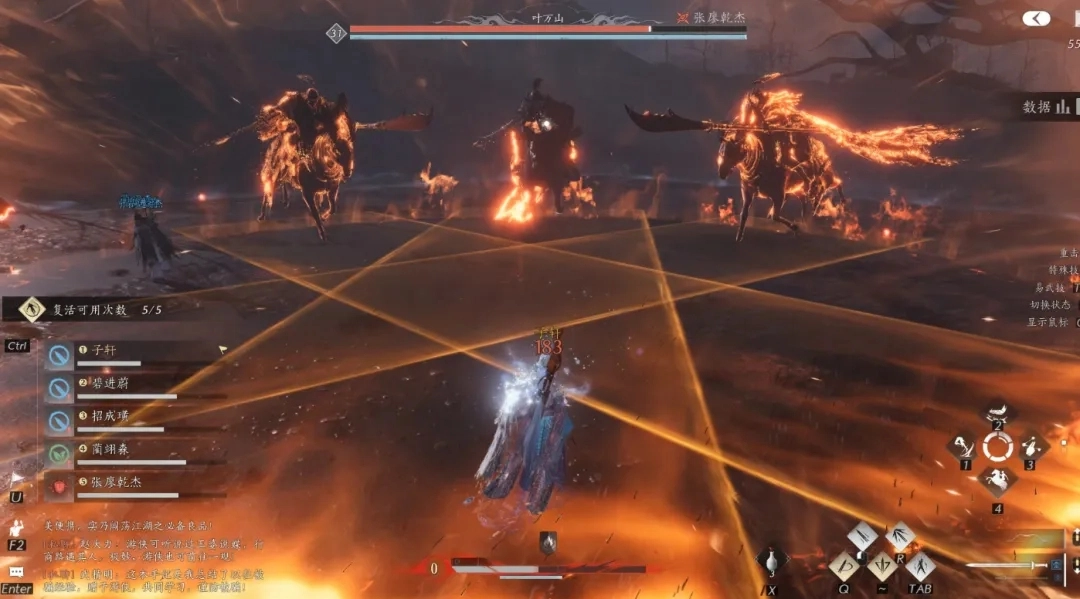 4、[不熄战火]:场上所有游侠会被限制在火焰圈范围内活动,叶万山则在火焰圈外召唤骑兵,指挥骑兵向圈内的游侠发起冲锋。与此同时,叶万山会在火焰圈外持续跑动并不断释放落日枪,直至该阶段结束。若游侠未能在限定时间内阻挡住足够数量的骑兵冲击,叶万山就会释放团灭技能。