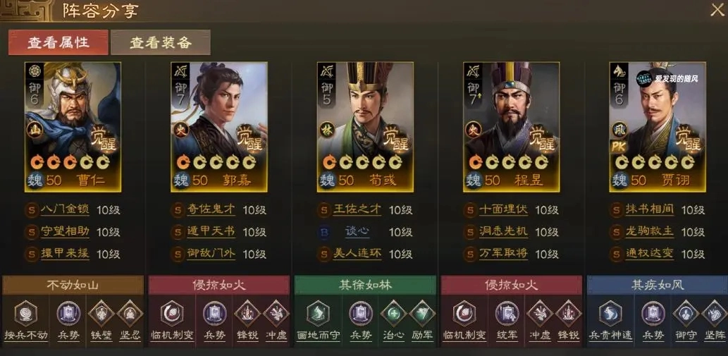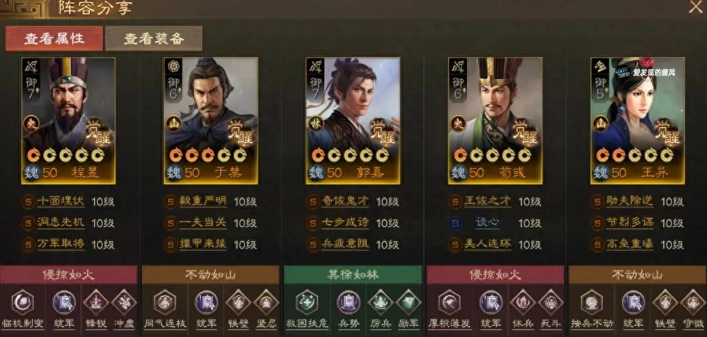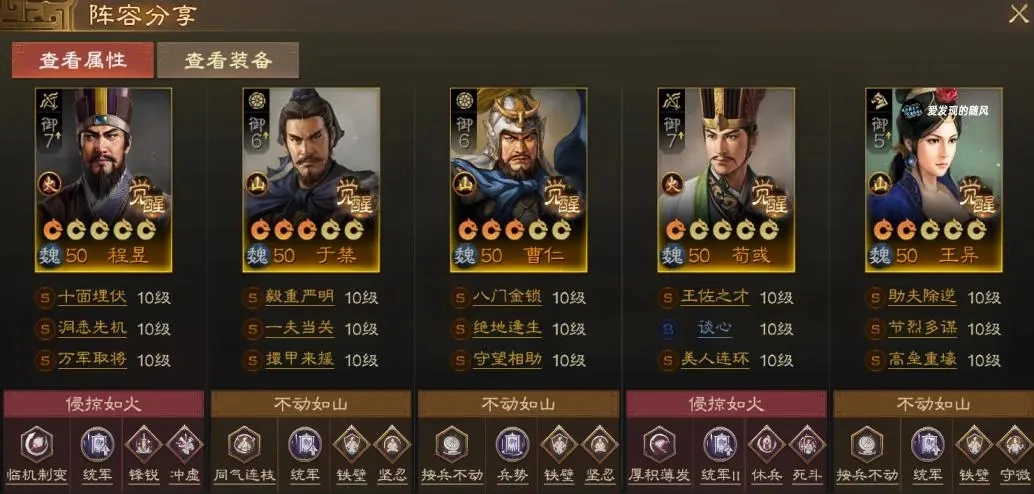 在前期敌方骑兵数量较多的阶段,可以把郭嘉替换成曹仁,通过双坦克的配置来保障程昱的生存。曹仁携带“绝地逢生”和“守望相助”两个技能,既能分摊伤害,又能提供治疗效果,以此强力保护程昱。其余配置与使用郭嘉时的版本差异不大。