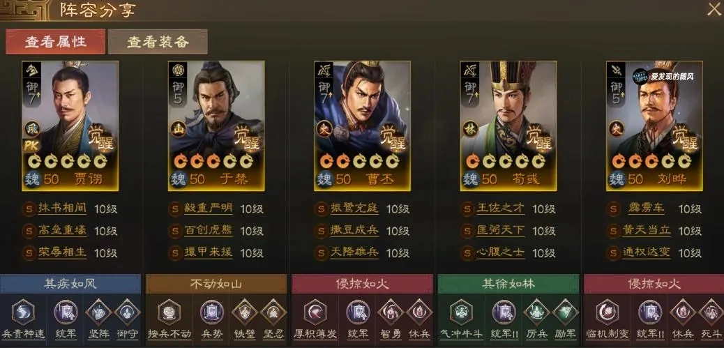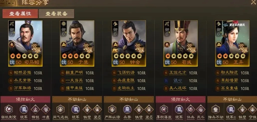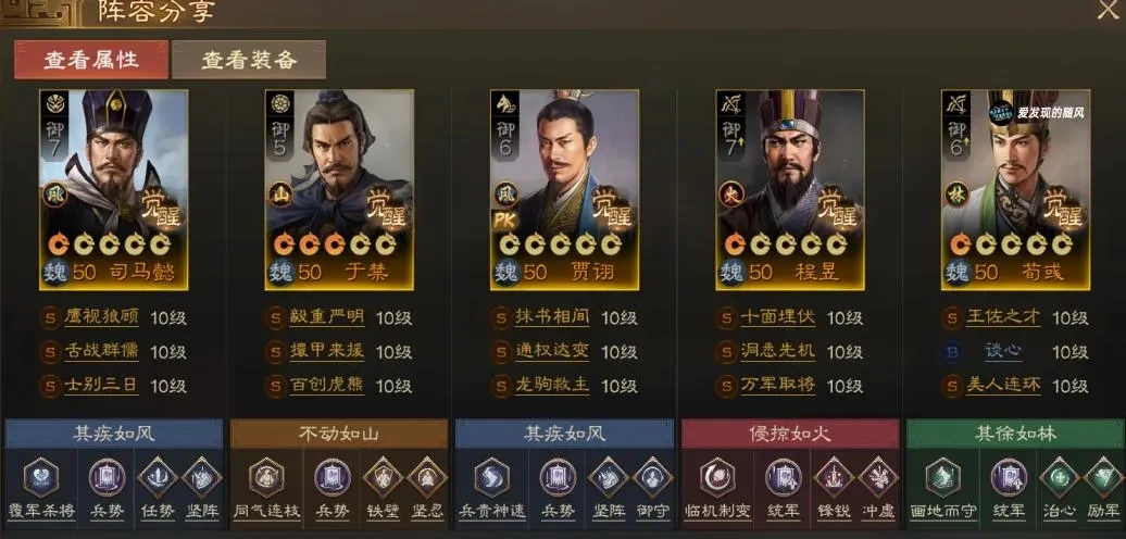 另一种非单核C的组队思路是搭配司马懿,给他带上士别三日,再配上舌战群儒或者五雷轰顶,这样前三回合面对魏延也不用怕。后续贾诩负责提供控制效果,荀彧辅助程昱,于禁则承担保护队友的职责。