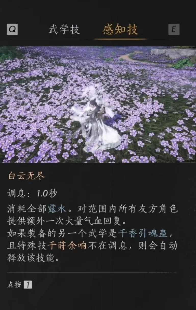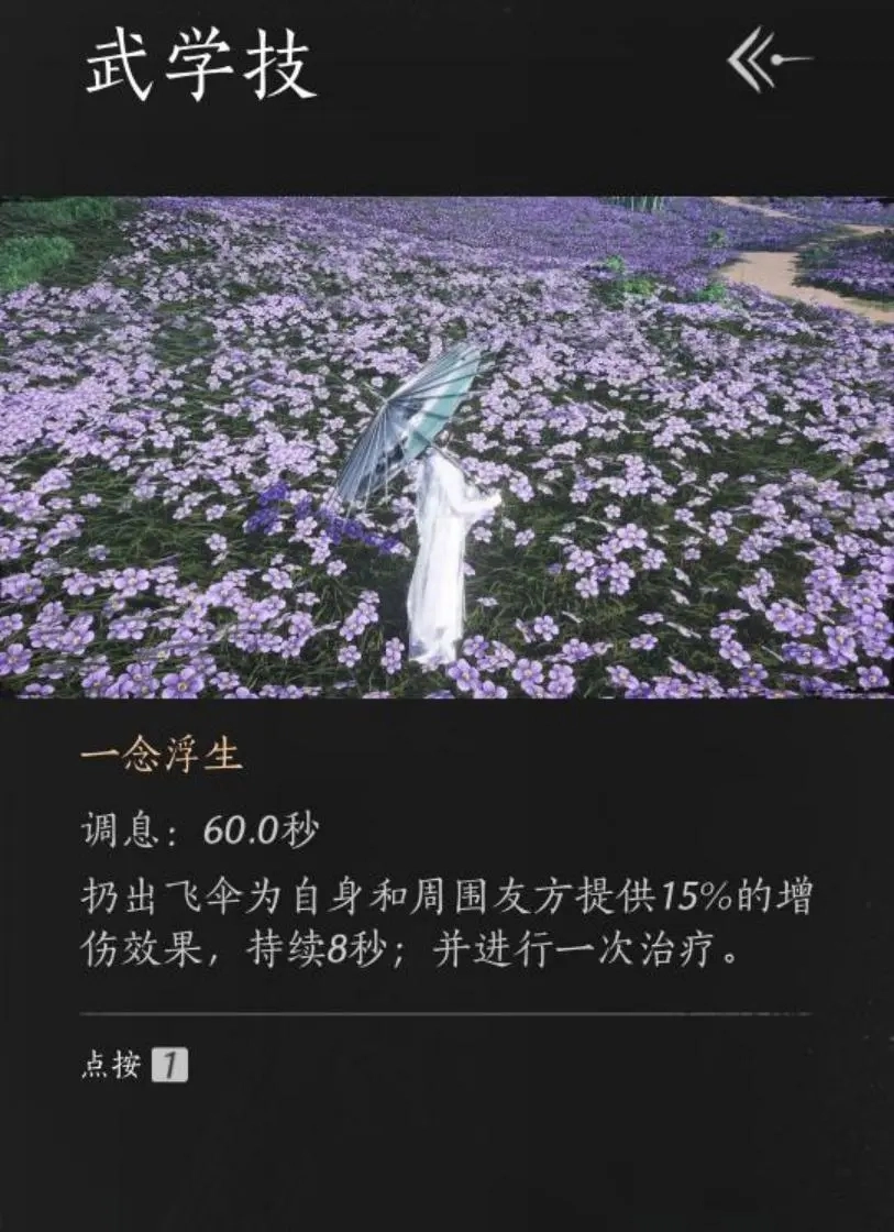 然后切伞,释放武学技“一念浮生”——这个技能相当核心,能一次性为队友回复近20000点生命值,还能附加15%的增伤效果并持续8秒,绝对是神级技能。一定要等队友都在输出时再使用,之后切换特殊技,它能持续60秒自动识别并为队友回血。