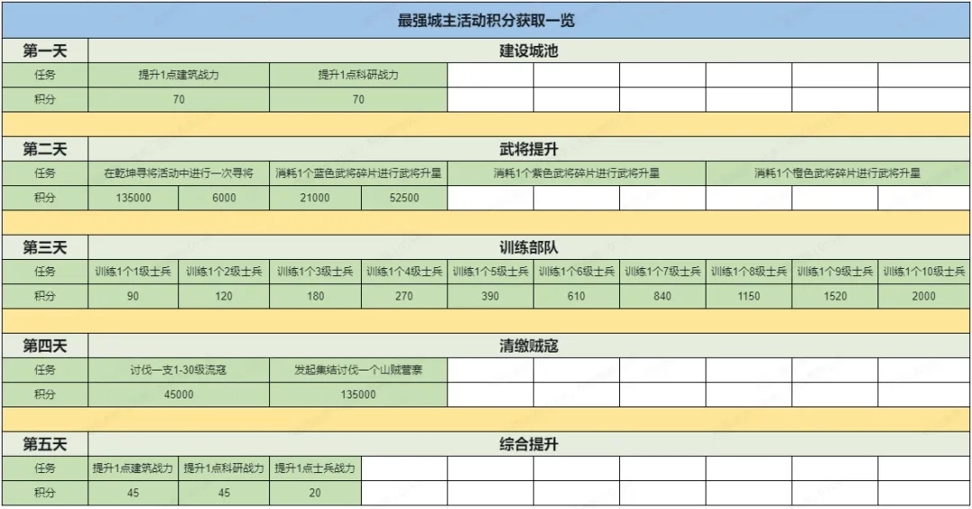 4)第一期之后的【最强城主】活动会增加不同的任务,后面参与该活动时需要提前看一下每天的任务,合理规划好资源进行冲榜。