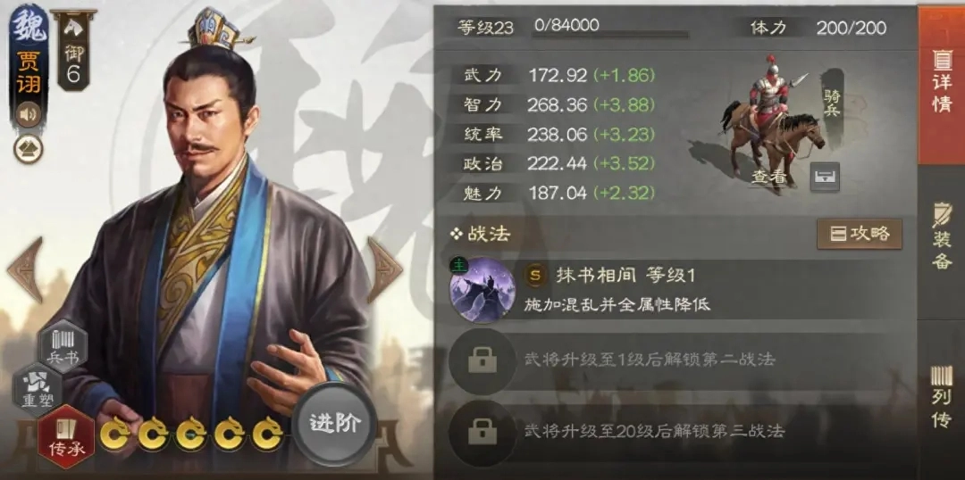 贾诩绝对是最实用的工具人之一,他那霸道的直接控制效果,不仅能限制对手,还能在控制结束后让敌方陷入震慑状态,这直接让不少阵容在前期难以施展拳脚。不过洞察状态对他来说还是挺克制的,而且AI操控的贾诩偶尔会犯傻,把自带战法丢到有洞察的单位身上,实在有点可惜。
