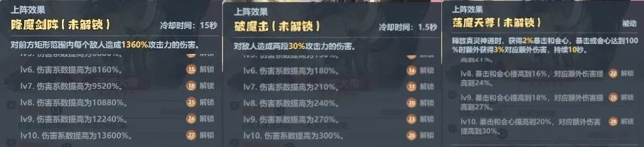 被动效果为增加暴击与会心属性,当这两项属性数值达到100%时,将额外获得3%的对应伤害加成;若达到满星状态,暴击和会心属性可提升20%,对应伤害则提高30%。