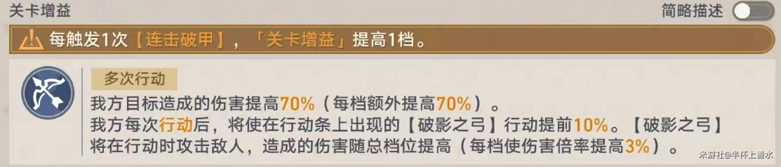 增益BUFF每叠加一层,就能提升70%的伤害;我方角色每进行一次行动,都会让【破影之弓】的行动进度提前10%。