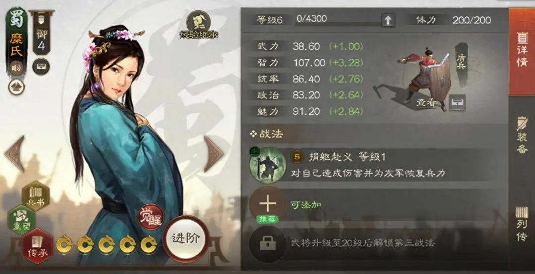 三国志战棋版新赛季推出的武将糜氏,隶属于蜀国阵营,定位为4御盾兵。她是典型的智力型武将,武力成长值仅为1,智力成长处于中上层次,统率成长则属于中等水平。考虑到她是4御武将,这样的属性成长表现可归为中偏上水准,后续通过兵书系统提升御值后,其属性与常规武将的差距将进一步缩小。