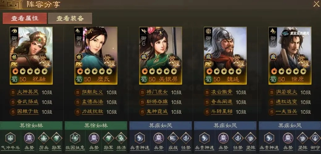 祝融主要承担增伤职责,糜氏负责队伍治疗,同时搭配孟德兵法来进一步提升伤害,这样还能空出一个位置带光环类战法,这里选择的是新事件战法“力战抗敌”——相当于强化版的舍身救主。糜氏可以增强友军的生存能力,确保关银屏、魏延这类输出核心的存活与持续作战能力。
