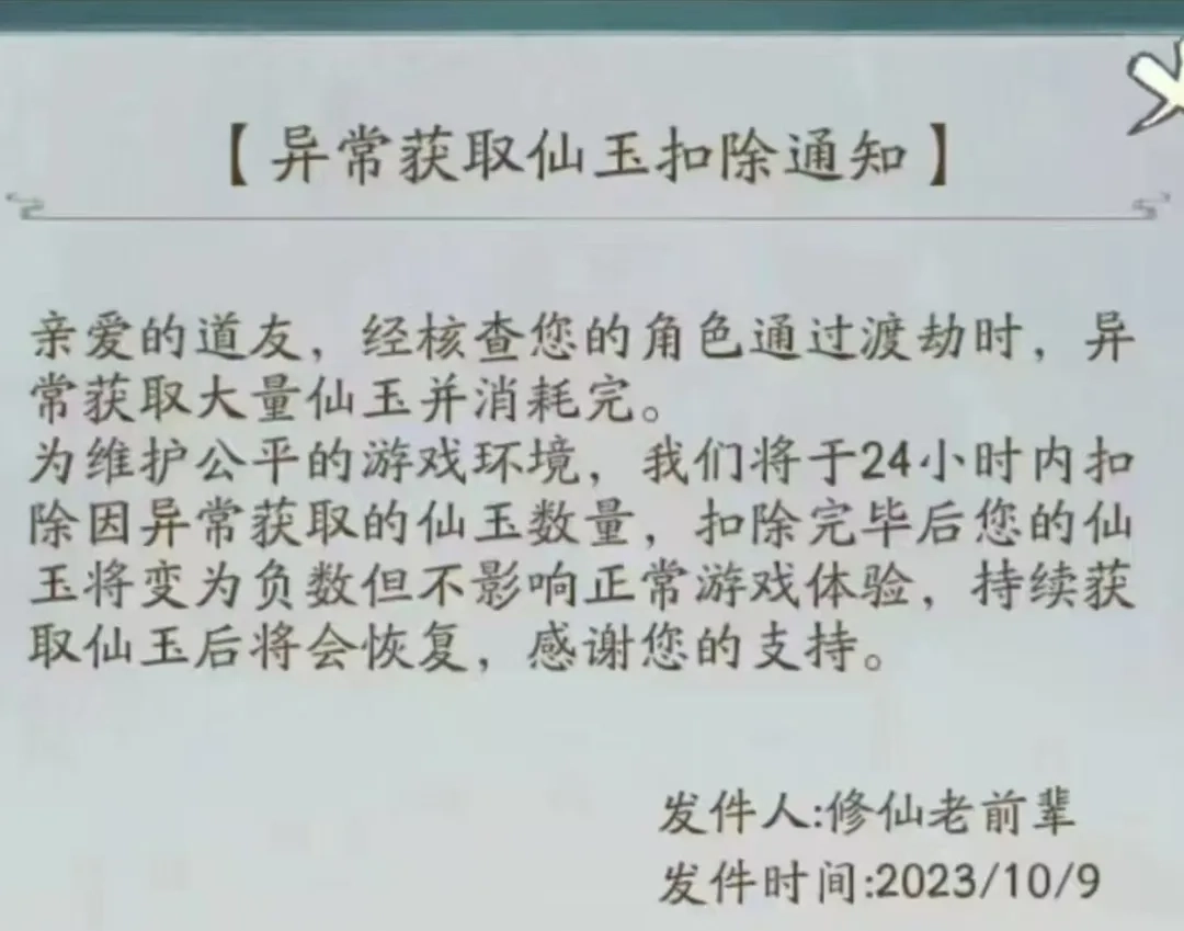 ·涉及的仙玉数量少则几千,多则高达200万,还有若干张仙居图纸,目前都已被扣除至负数状态。重新登录游戏时会显示为0,但一旦获取仙玉,就会立刻呈现出扣负的数值。