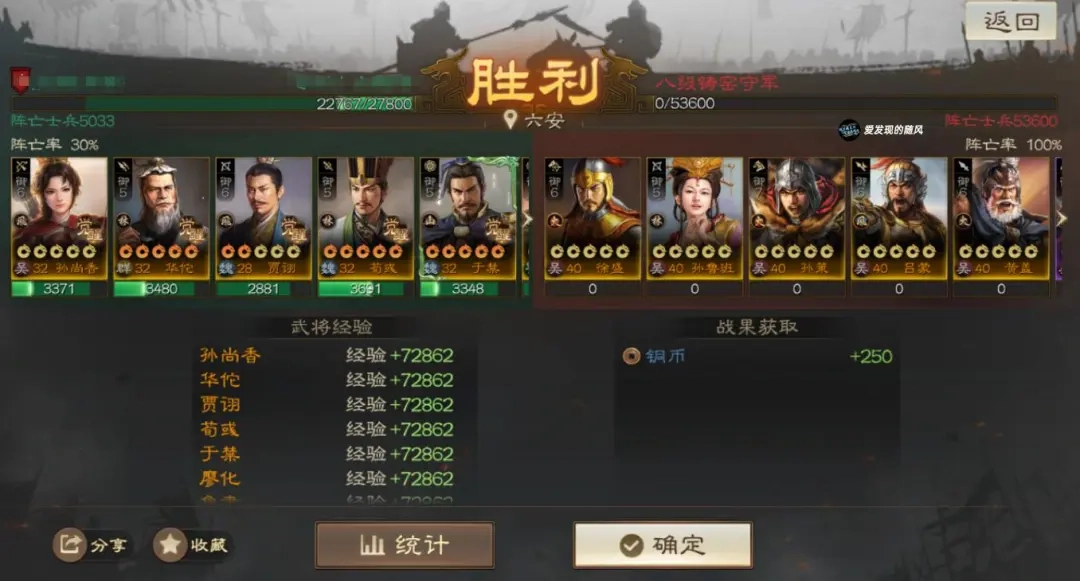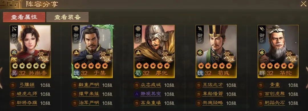 战法还是和上面说的一样,这里只有一个变化,就是孙尚香把止戈散马换成了斩将夺旗。主要原因是32级的白板香香伤害不足,只有换上斩将夺旗才能让伤害达标。
