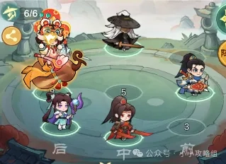 ①进场时借助乌龟的被动技能(进场后全体能免疫两次伤害),中间位置让凌云志先抗4次伤害(由于携带了广陵散,能多抗两次),上下位置的剑尊和花木兰各抗两次,按照这个思路抗完后,点击水月的大招还能继续抗两次伤害。
