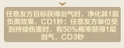 友方获得剑气时,净化负面效果,友方受到持续伤害时,概率获得剑气