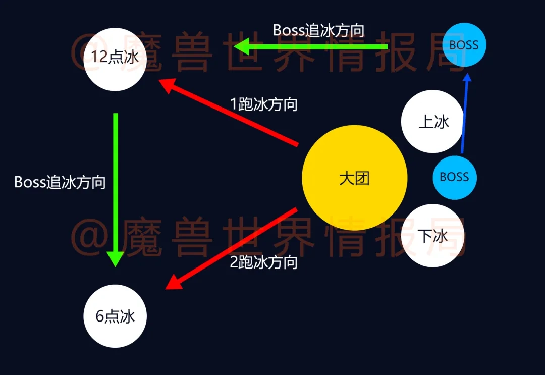 5)Boss在破除12点方向的冰面后会继续点名,被点名的玩家需向6点方向的冰面位置移动,大团保持原位即可,无需移动。