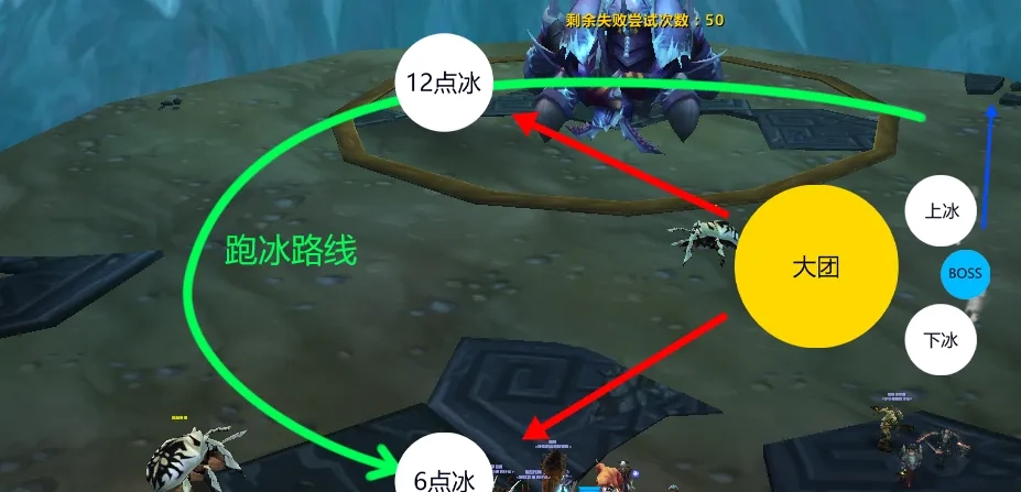 1)开局由两名拉冰DK将冰拉至场地右侧,按图示的上下冰位置摆放,MT把Boss拉到两块冰的中间位置,大团成员则站在黄色圆饼标记处。