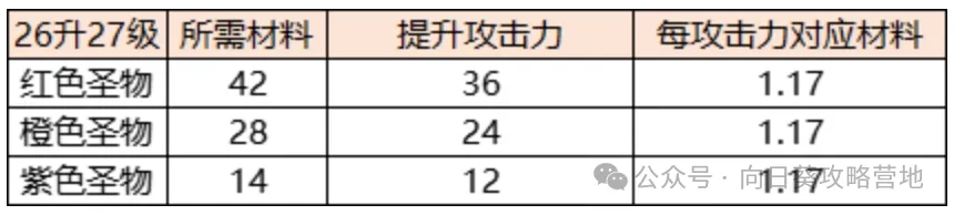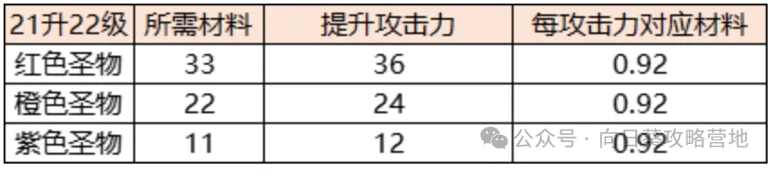 说明:无论什么颜色的圣物,在22级时升级1点攻击力都需要0.92个圣灵石。升到27级时,紫色圣物需要14个圣灵石,橙色需要28个,红色需要42个,每提升1点攻击力都需要1.17个圣灵石。
