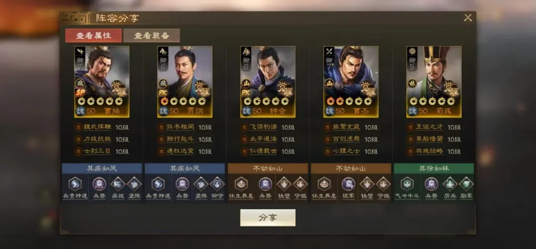 SP曹操被纳入【经纬山河】的缘分体系,荀彧作为纽带联结SP曹操,助力其提升自身伤害,使其能在第三回合释放【士别三日】实现高额爆发;贾诩则承担着突入敌阵、扰乱对方部署节奏的职责;钟会的自带技能可对各类被动效果与回复机制形成克制;曹丕召唤出的生物具备援护友方和回复生命值的技能。