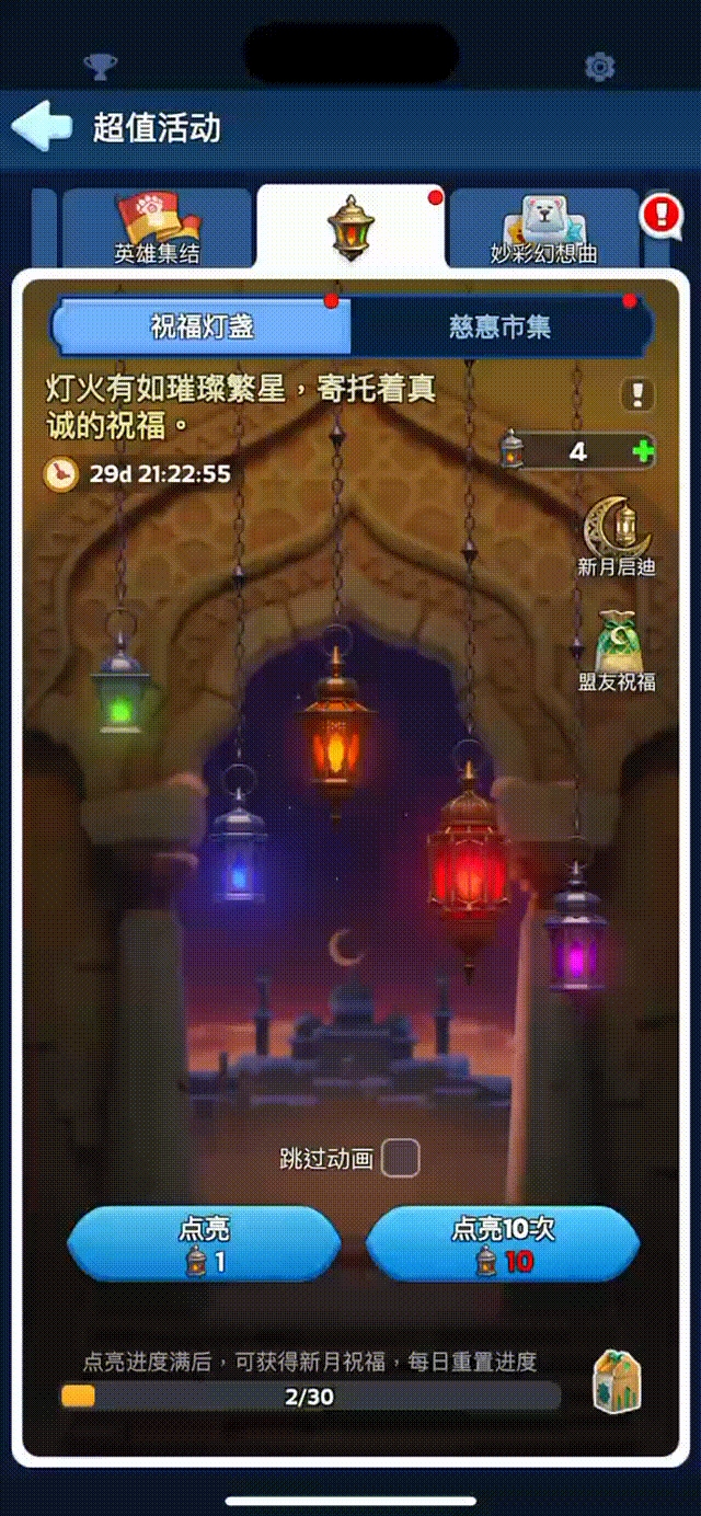 简单来说,就是通过获取灯盏道具进行点亮,能得到【慷慨徽记】,而获得的新月道具可用于兑换市集里的物品;活动总共持续30天。