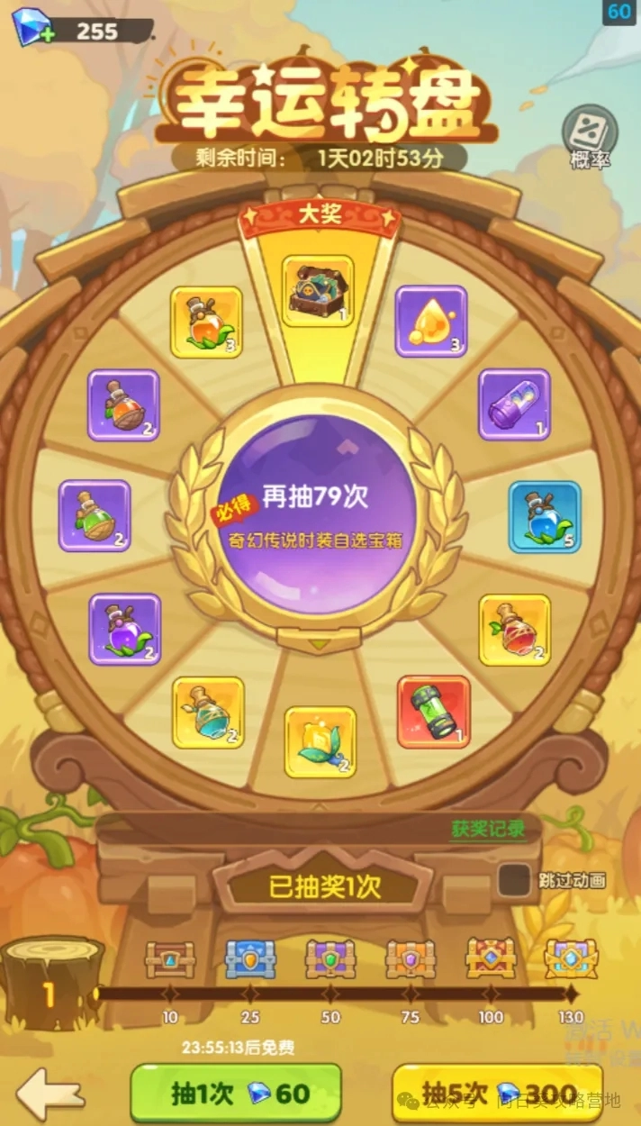 终极大奖累计抽取80次,共花费4800钻,届时必定能得到奇幻传说时装自选宝箱,并且还会额外赠送植物升级过程中需要用到的各类资源。