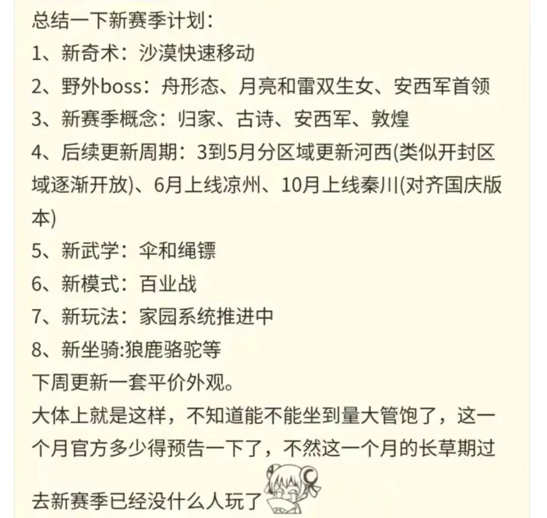 4、三月还会有不少新服装陆续上线,之后每期推出的服装都会通过问卷收集玩家反馈意见,另外还有狼、鹿、骆驼等新坐骑。