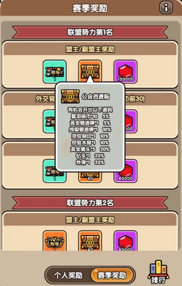 ②赛季奖励:赛季结束后,会根据联盟排名通过邮件发送赛季奖励。包括称号、公会资源箱、红宝石。