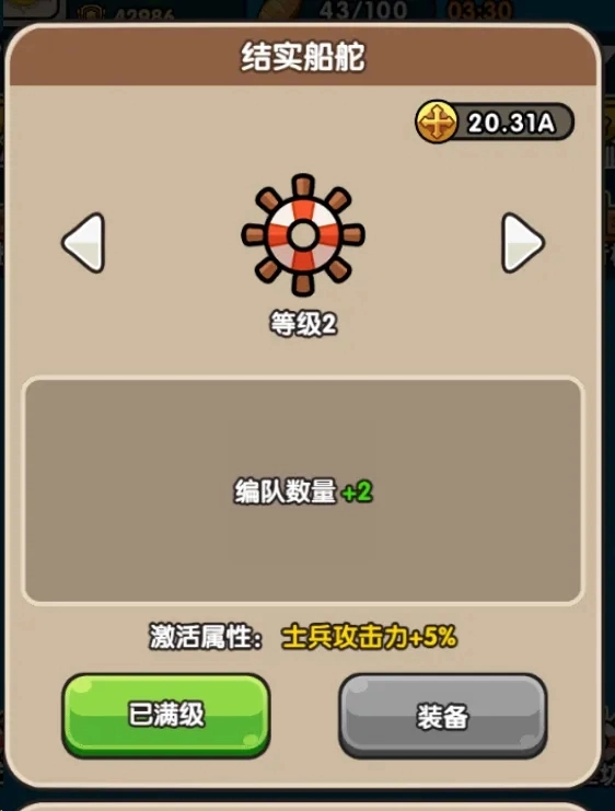 ②将工坊的结实船舵升到满级,解锁3个编队。