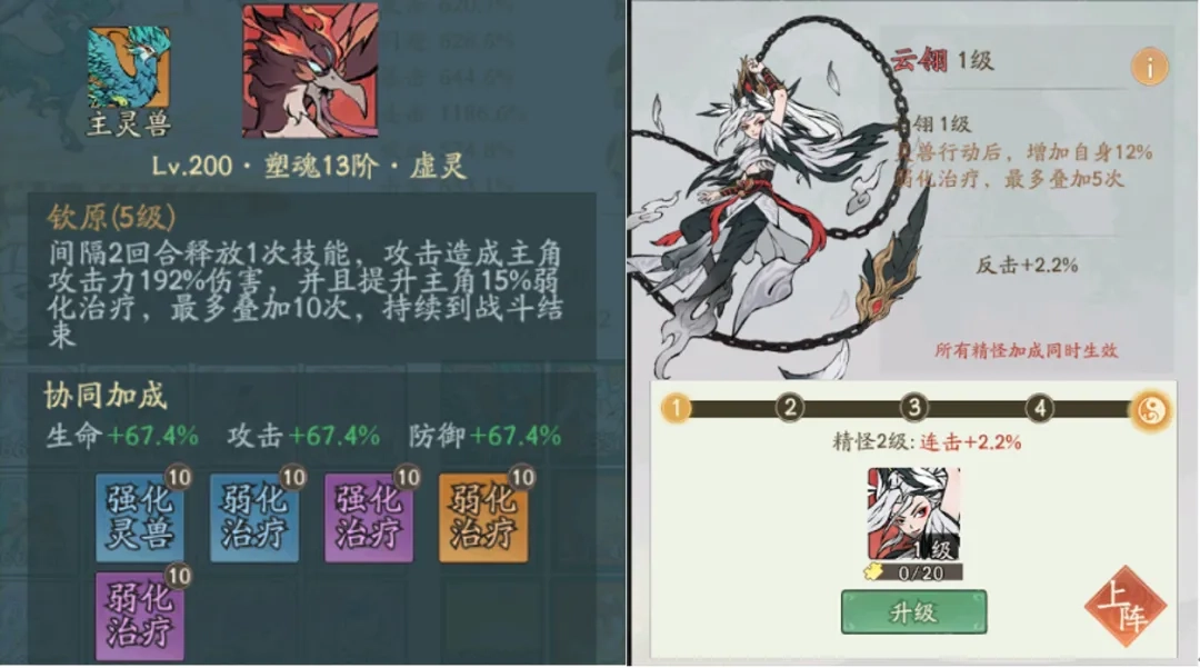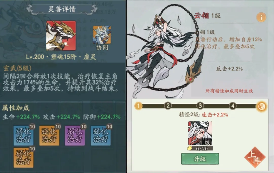 弱疗属性要是不堆到极限,基本很难看出效果!所以对想玩弱疗流派的玩家来说,提升弱疗属性特别关键!其中对战时加成最大的两个助力,一个是灵兽钦原,另一个是精怪元瑶(云翎)!除此之外,法则、法相洗练以及灵兽技能这些方面,也可以尽量洗出弱疗属性来!