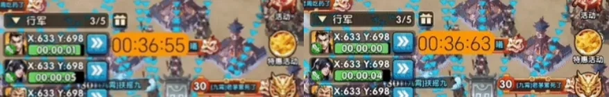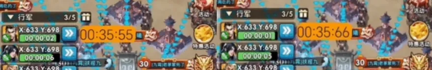 4、头车到达时间显示为10分10秒,假设头车的出发时间是9分35秒,那么他的行军时长应该是35秒整,是不是可以理解为35秒行军后攻击驻防?实际这样理解是有偏差的