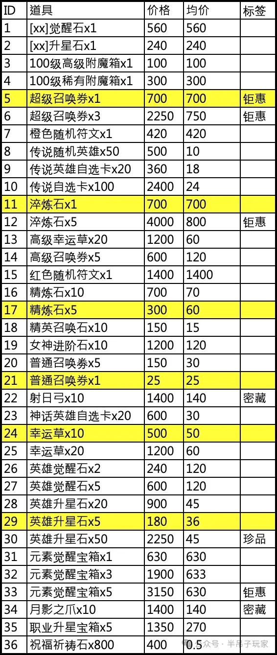 2、关于采购清单,建议根据实际需求来定。海淘秘市的商品并非贴了标签就更划算,一般来说,单次售卖数量越少的物品单价往往越低,因此不必执着于标签选购。以下是部分道具的价格及均价(黄色标注的为单价更低的物品)。